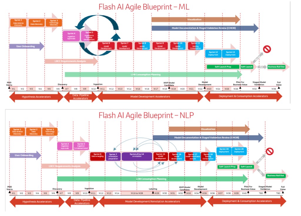 The diagrams below depicts a high level agile POD for ML and NLP models. Using these blueprints along with the BVA described earlier can lead to significant MDLC acceleration across, as high as 37% in some AI use cases.